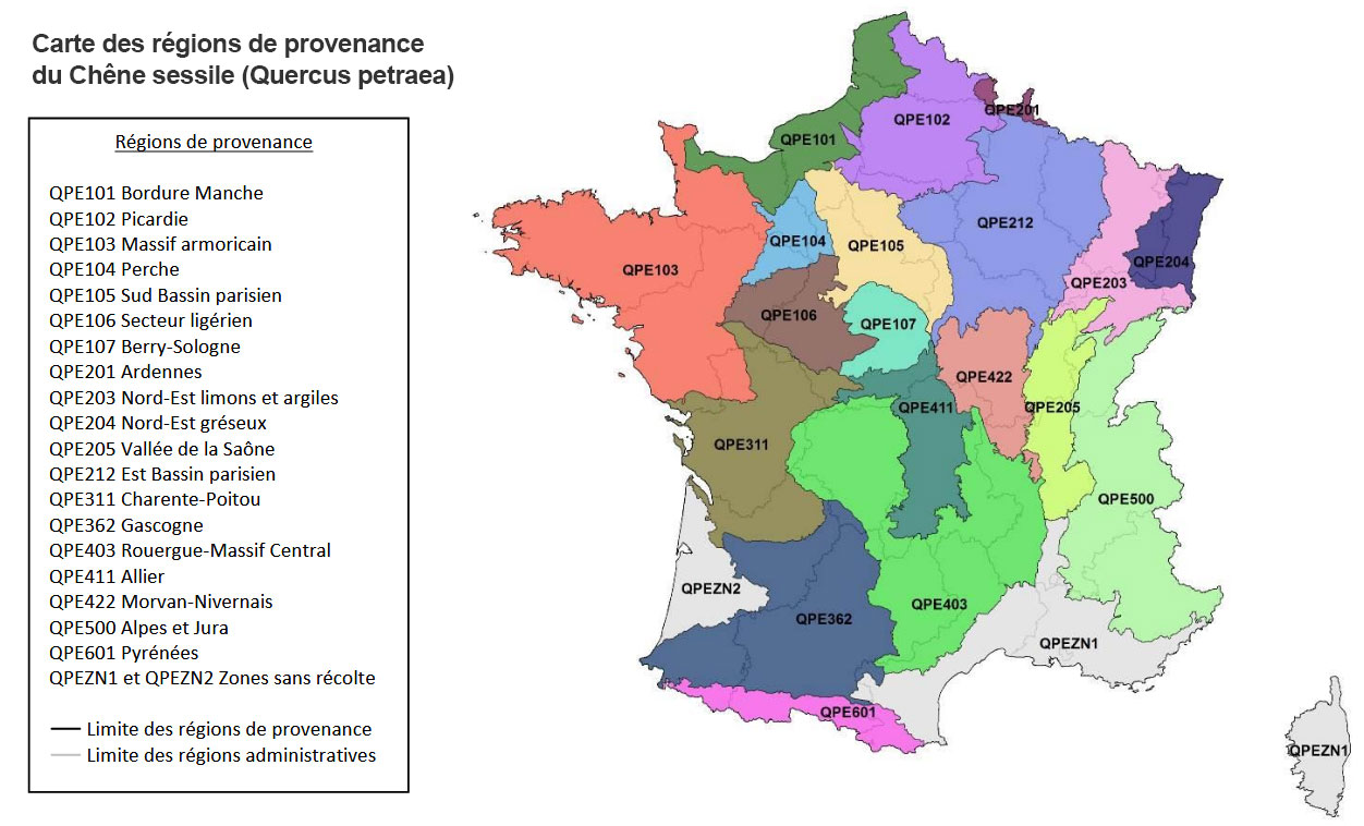 Chaque essence a son propre découpage de provenances. Voici quelques exemples pour illustrer le principe :